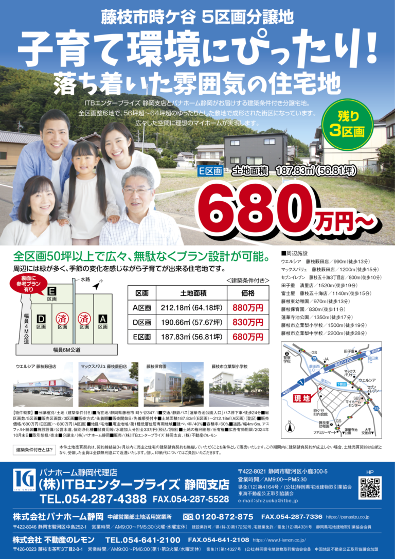 残り3区画! 藤枝市時ケ谷 全5区画分譲地 販売中!
